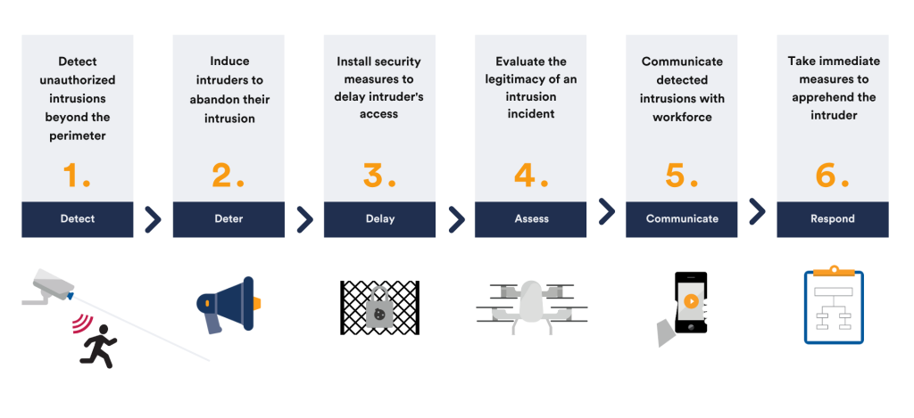 - شناسایی: استفاده از حسگرها، تحلیل ویدئویی حرارتی و بررسی فعالیتهای مشکوک برای تشخیص نفوذگران.